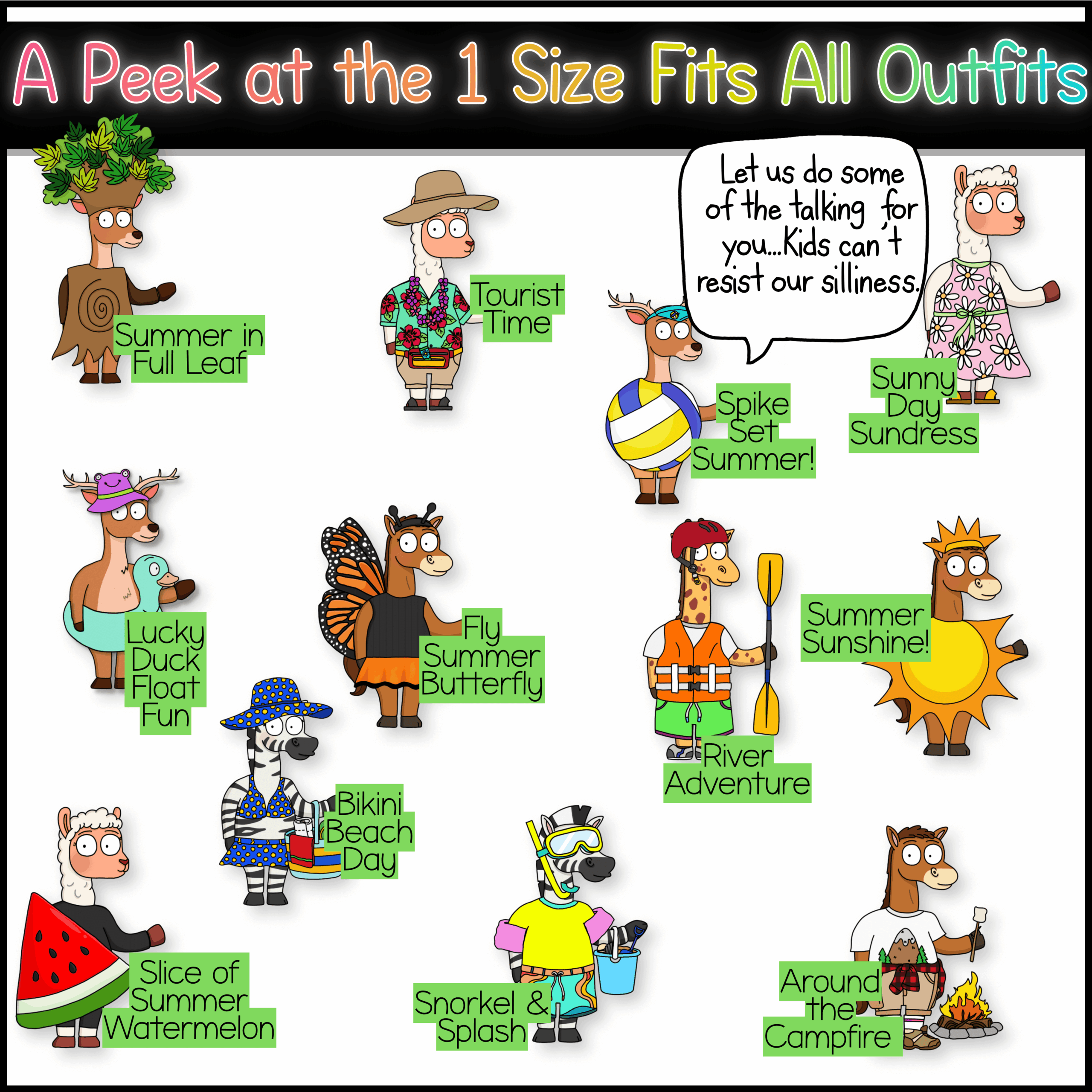 –12 Summer Mix-and-Match One Size Fits All Critter Outfits that fit all 5 animals (in color + black & white)