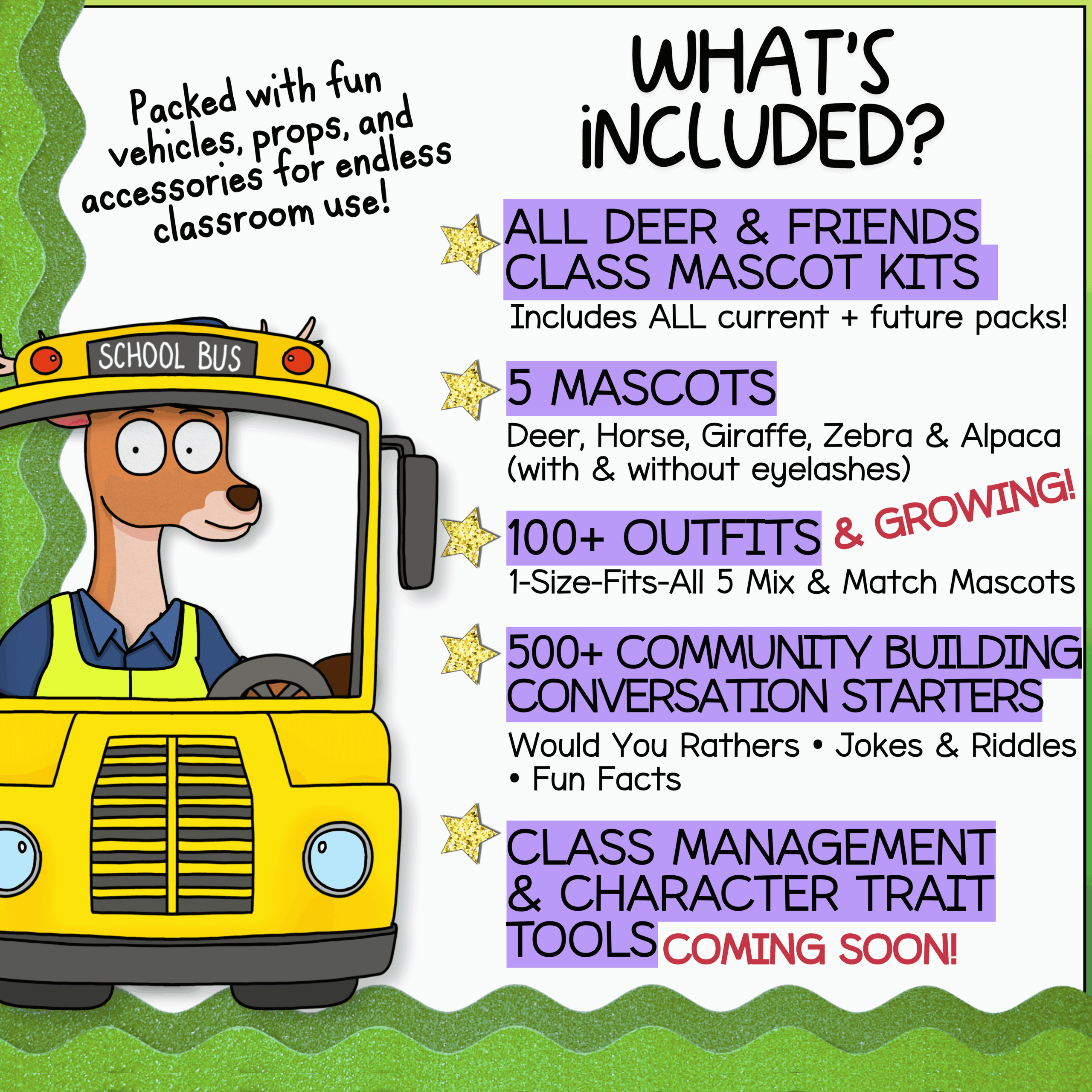 Over 20 themed kits are already in the works, adding 200+ additional costumes, plus accessories, conversation prompts, and printable tools. Each new kit will include an average of at least 10 mix-and-match outfits, along with coordinating extras to keep your classroom mascots fresh and engaging.