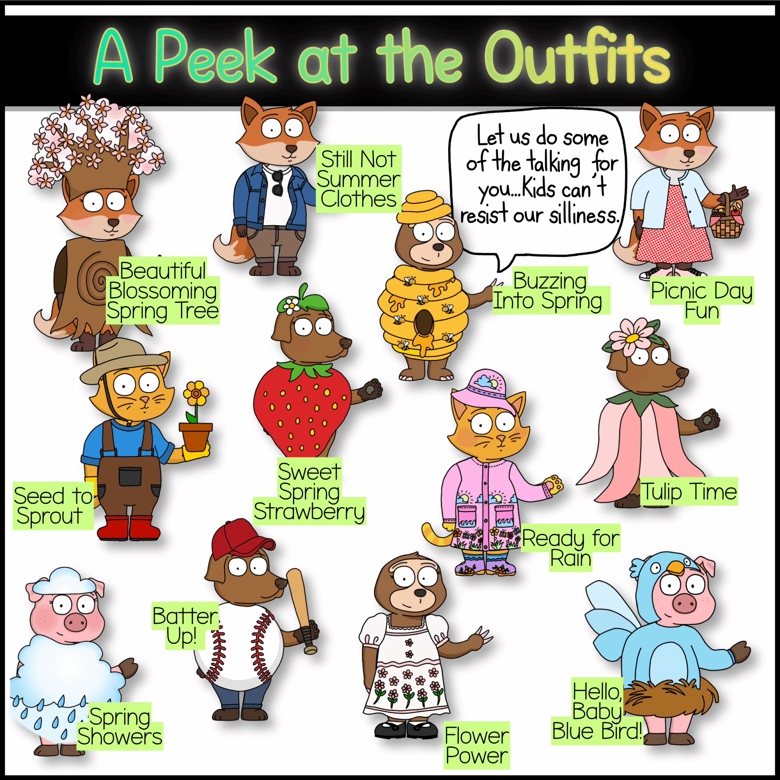 –12 Spring Mix-and-Match Critter Outfits that fit all 5 animal mascots in this pack (in color + black & white)