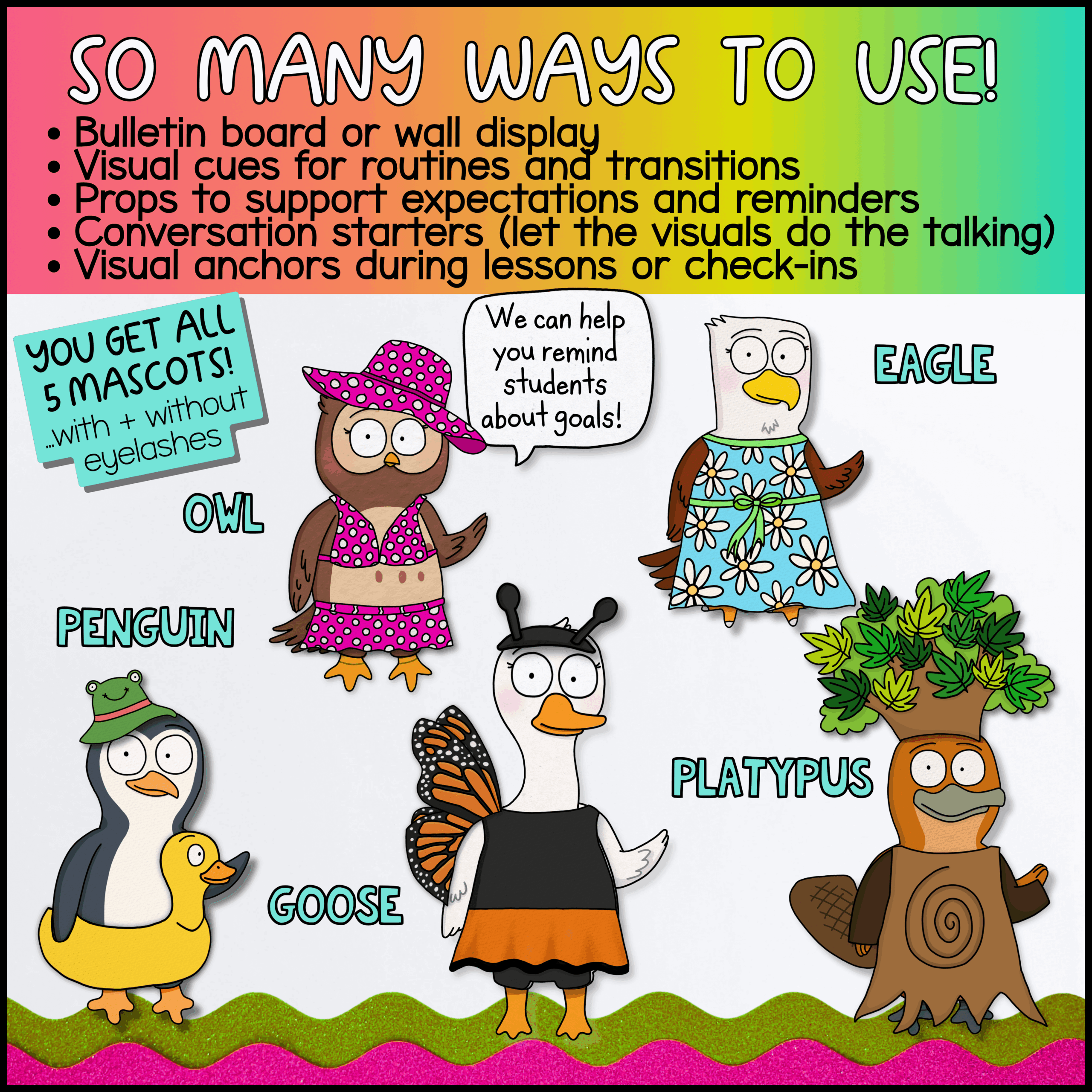 –5 Mix-and-Match WholeHearted Critter Crew™ Classroom Mascots (each included with or without eyelashes…so it sort of makes it 10 characters, right 😉