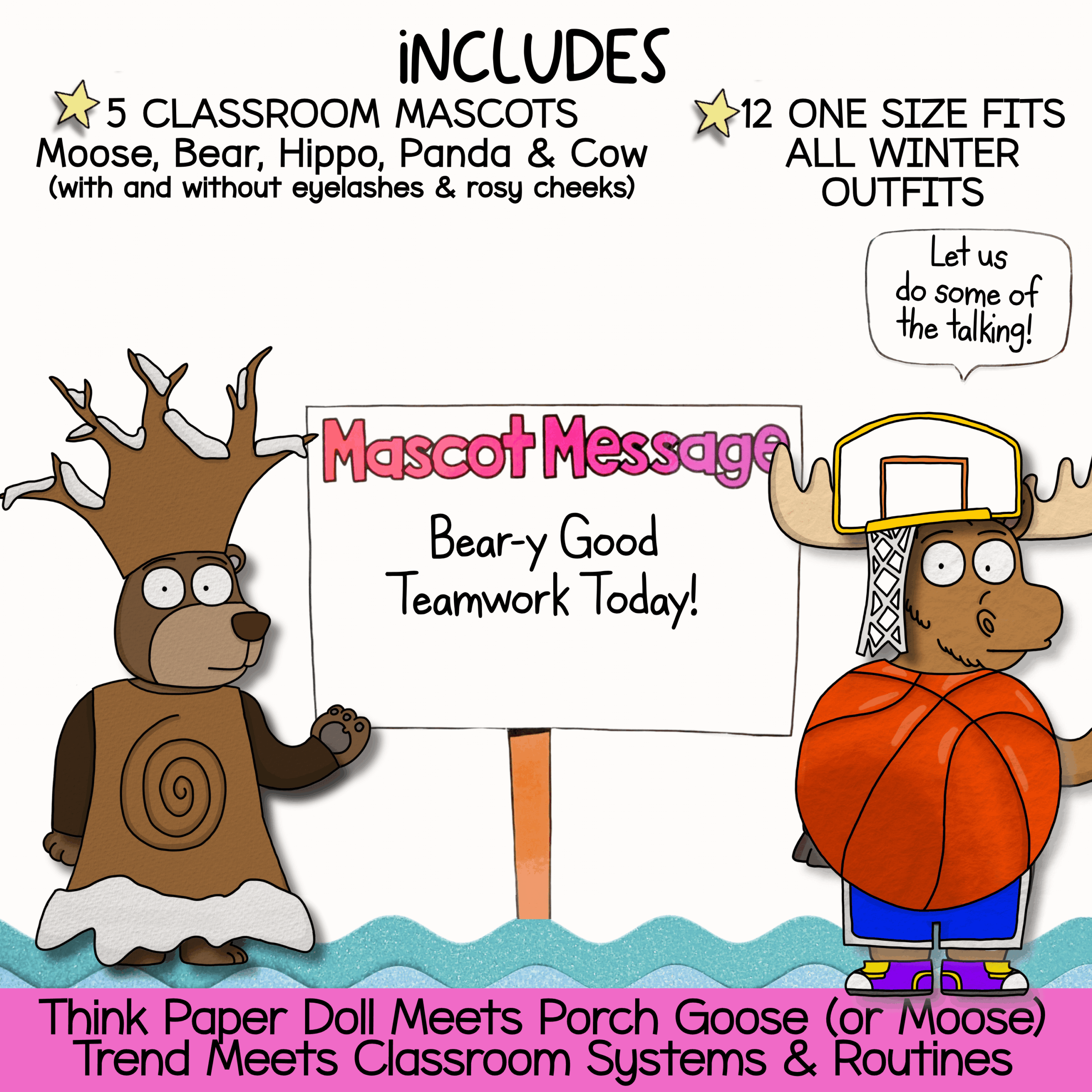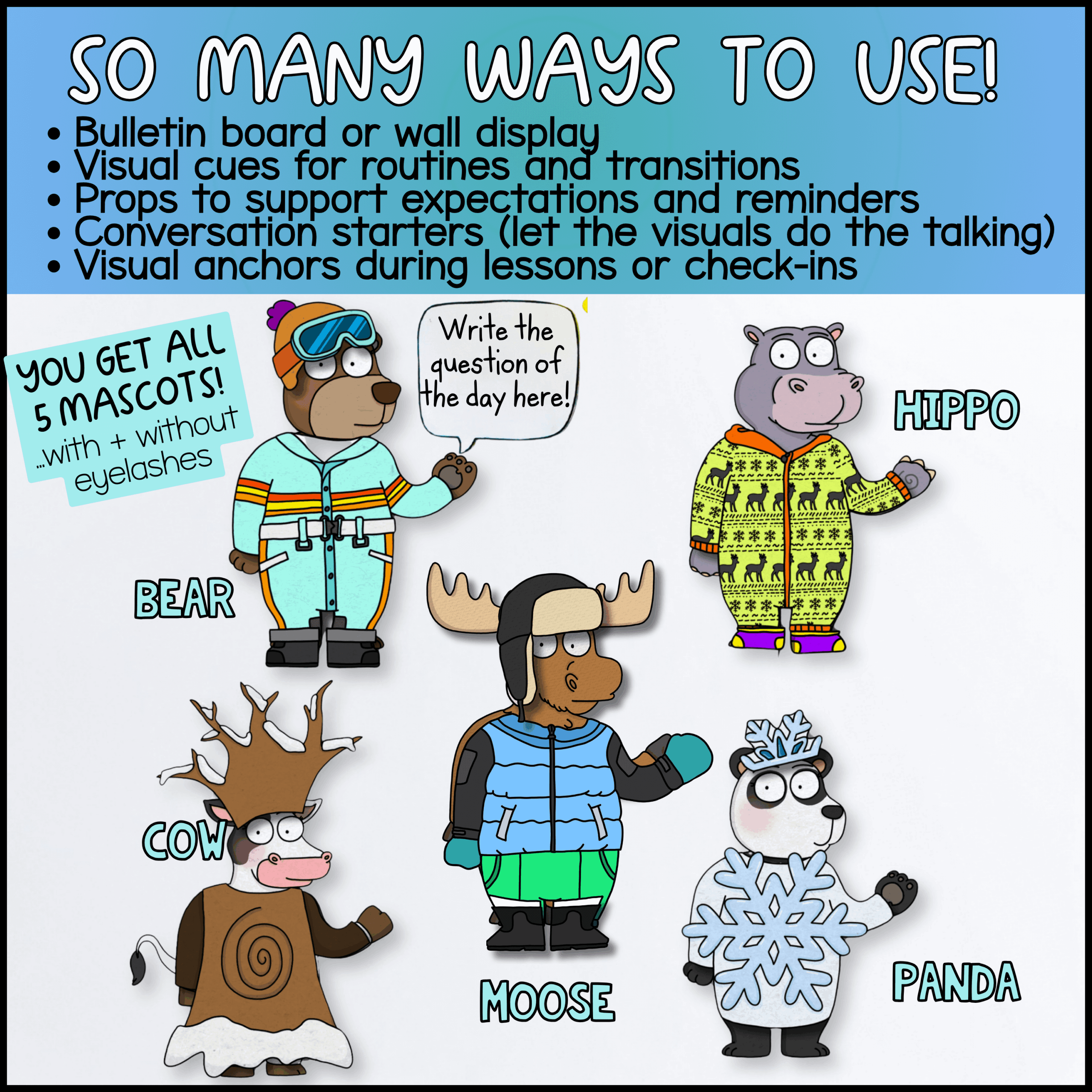 This Classroom Mascot Winter Kit is designed to work with the WholeHearted Critter Crew™ Moose and Friends Mix-and-Match mascot system.