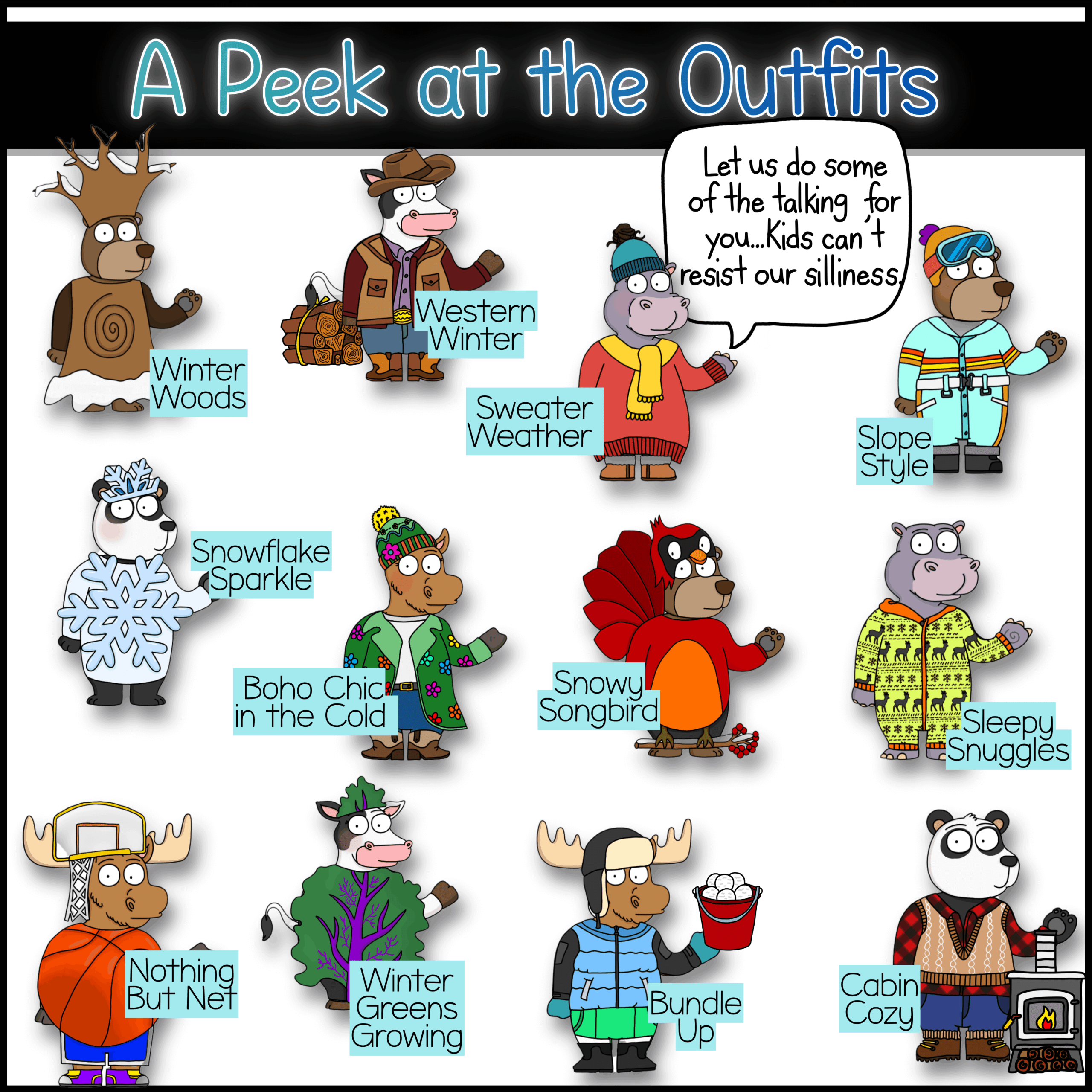 –12 Winter Mix-and-Match One Size Fits All Critter Outfits that fit all 5 animals (in color + black & white)