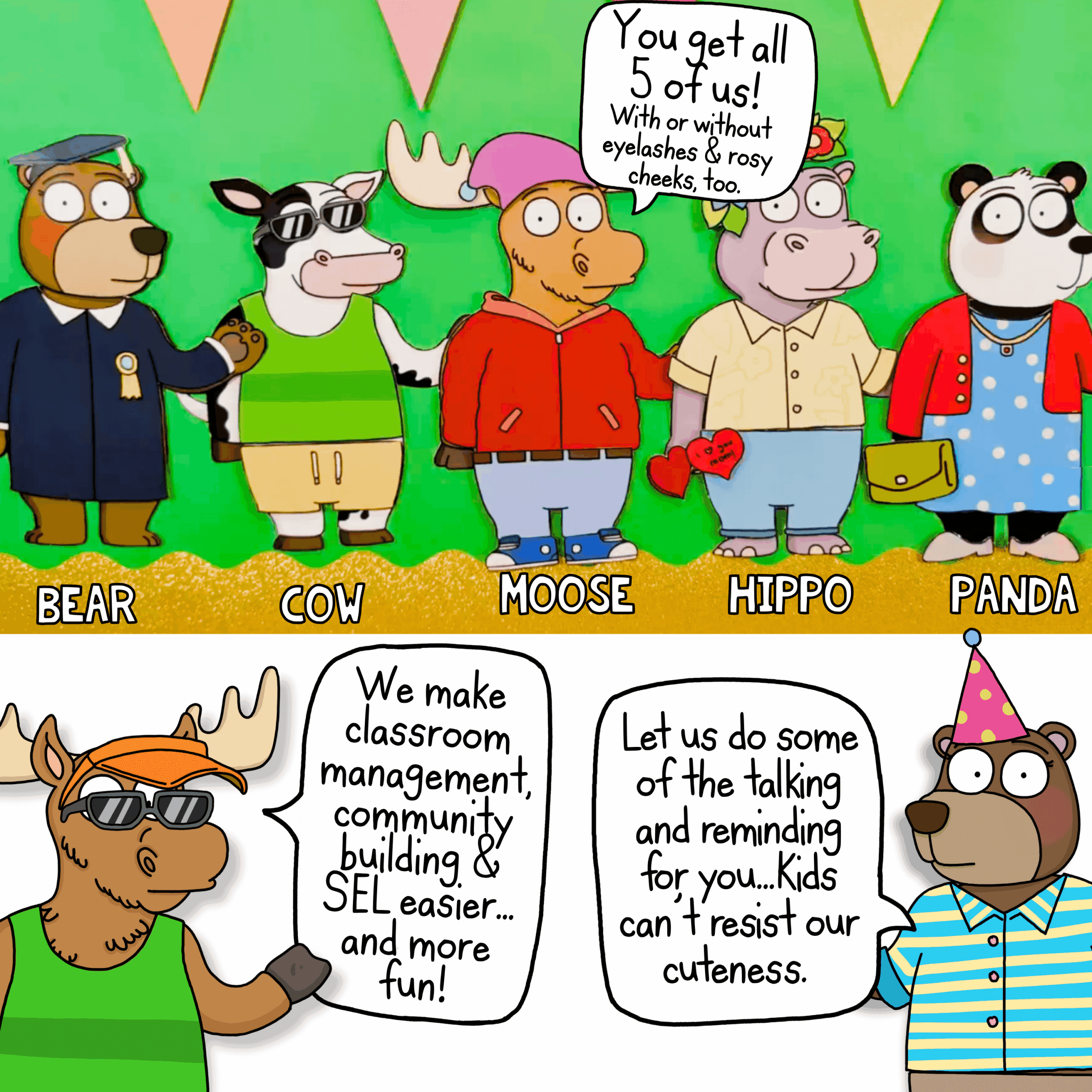 5 Classroom Mascots: Moose, Bear, Hippo, Panda and Cow(each included with optional eyelashes & rosy cheeks)
