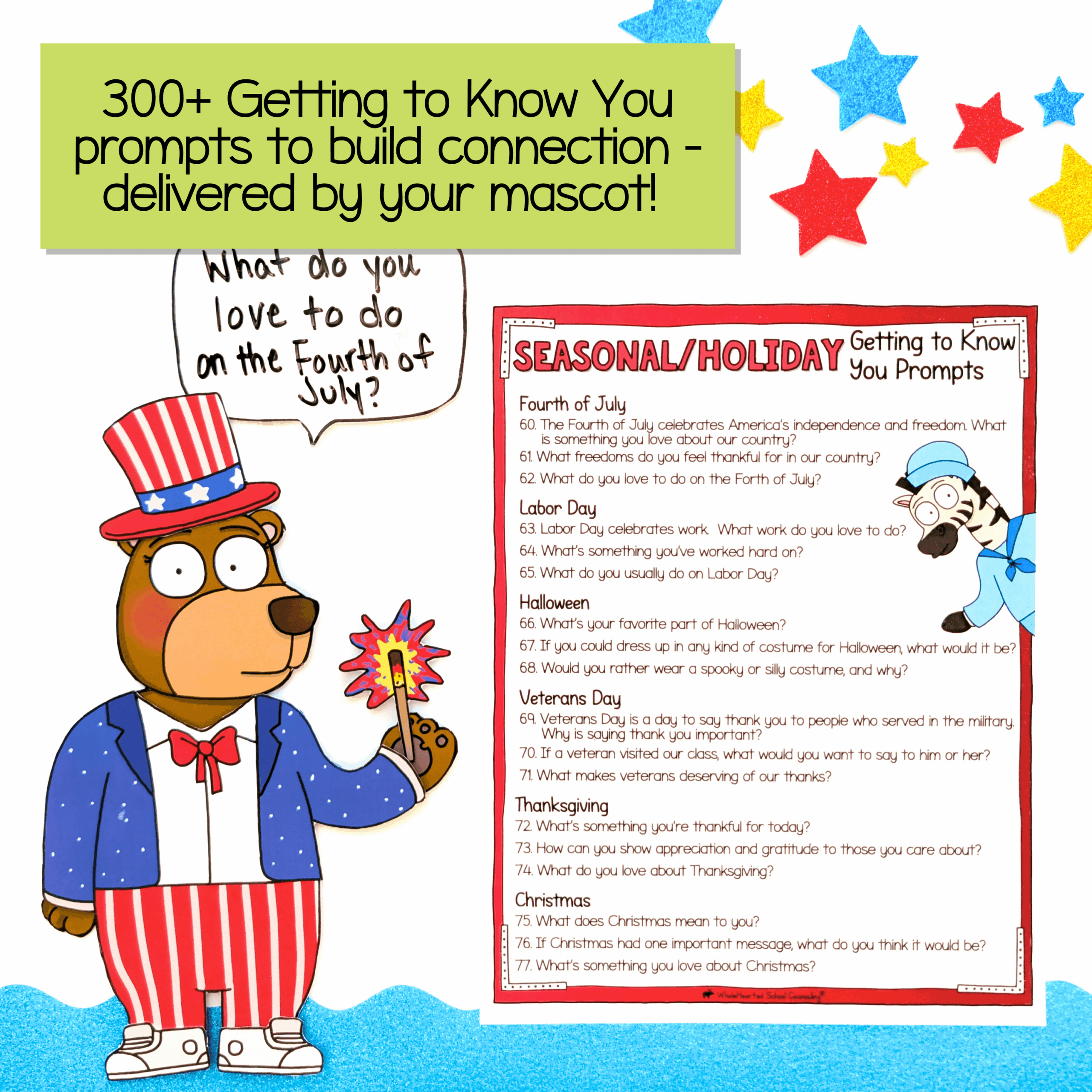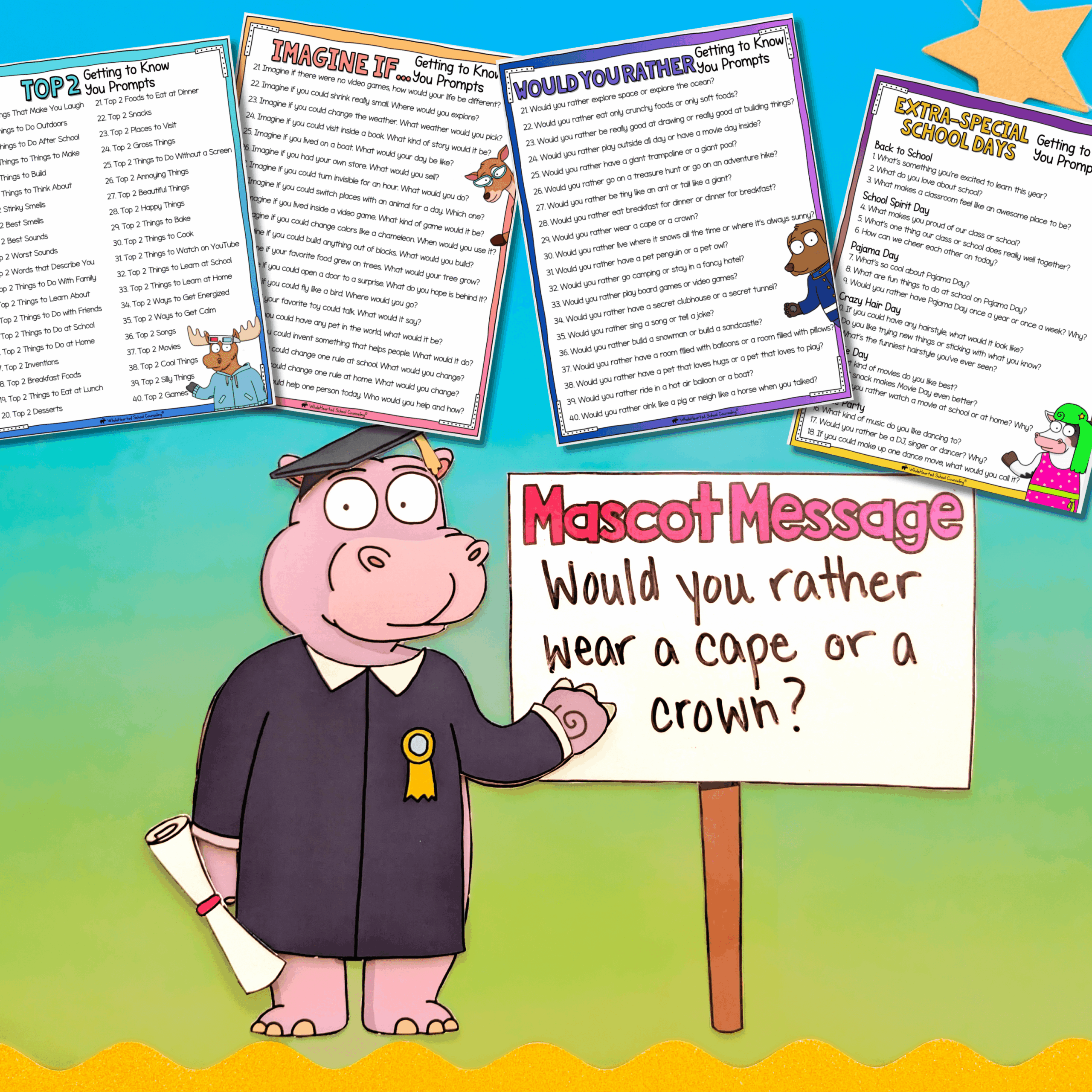 300+ Conversation Starters and Getting-to-Know-You Prompts, perfect for Morning Meetings, journal writing, counseling sessions, quick discussions or reflection time. The categories are: Top 2, Would You Rather, Imagine If, Complete It, You Just…, and Seasonal/Holiday open ended questions.
