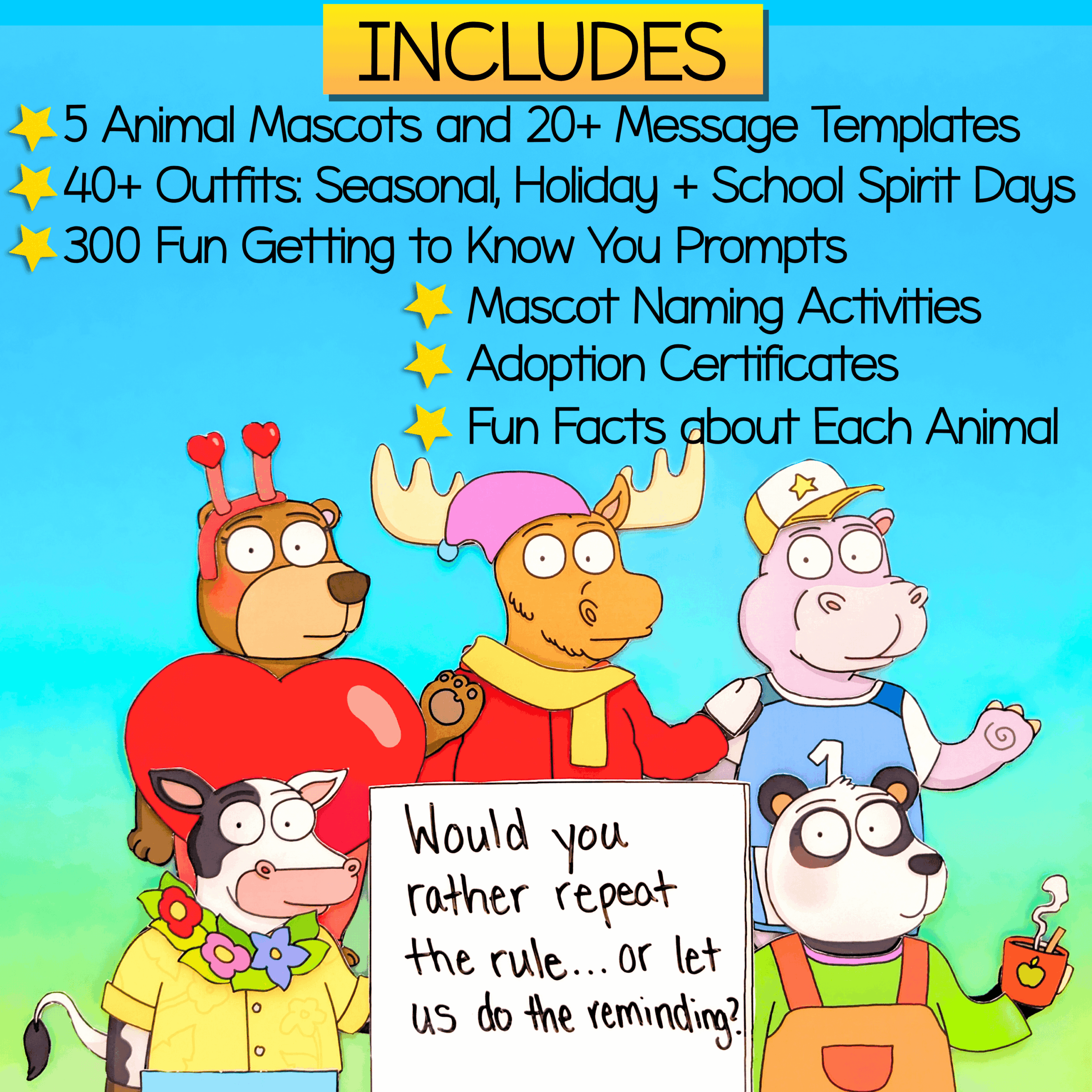 With 5 different WholeHearted Critter Crew™ animals to choose from – the Moose, Bear, Hippo, Panda and Cow plus over 40 adorable outfits, this mix-and-match mascot system will keep your students engaged for the whole school year.