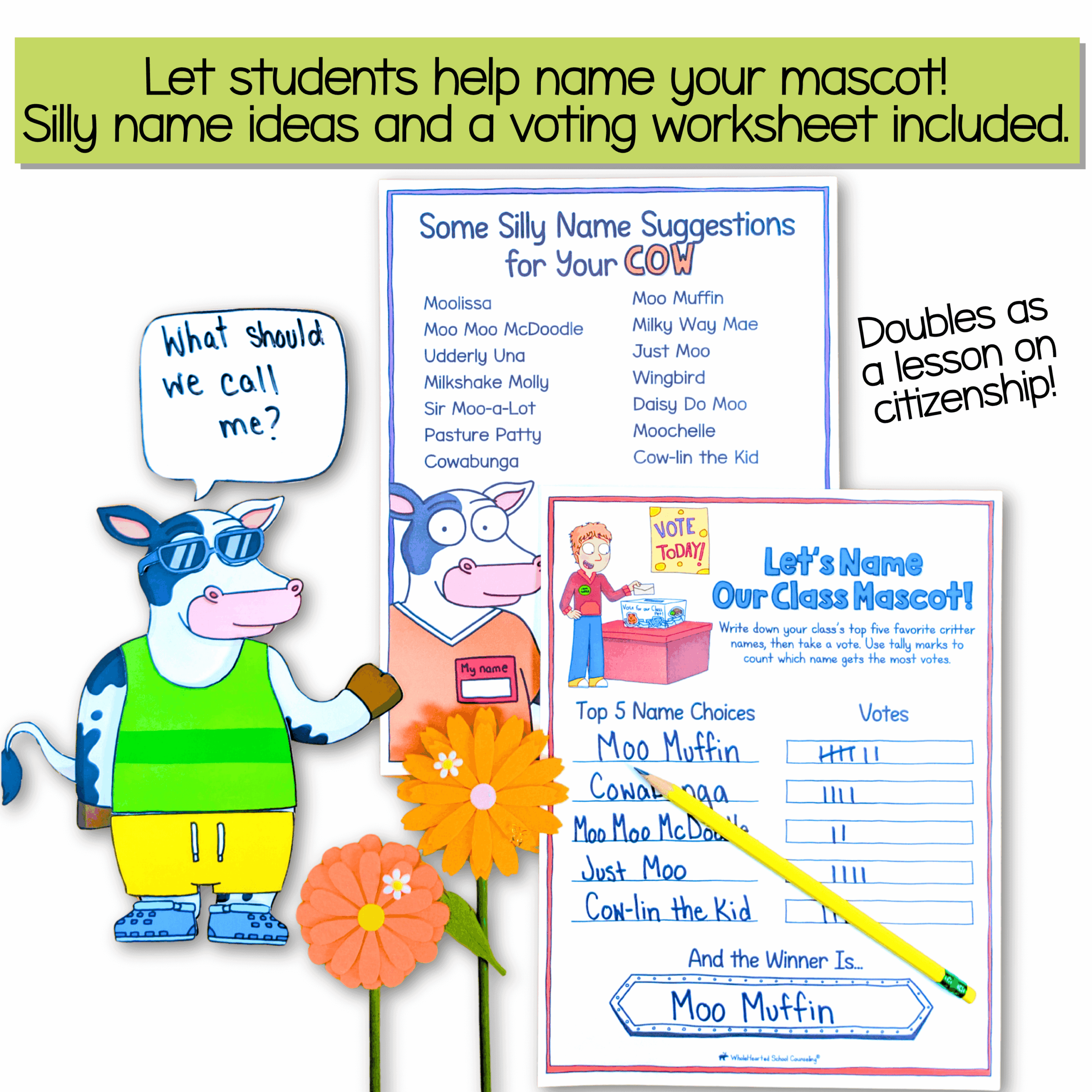 Mascot Naming Activities, including silly name ideas and a class voting worksheet (great for a mini lesson on citizenship!)